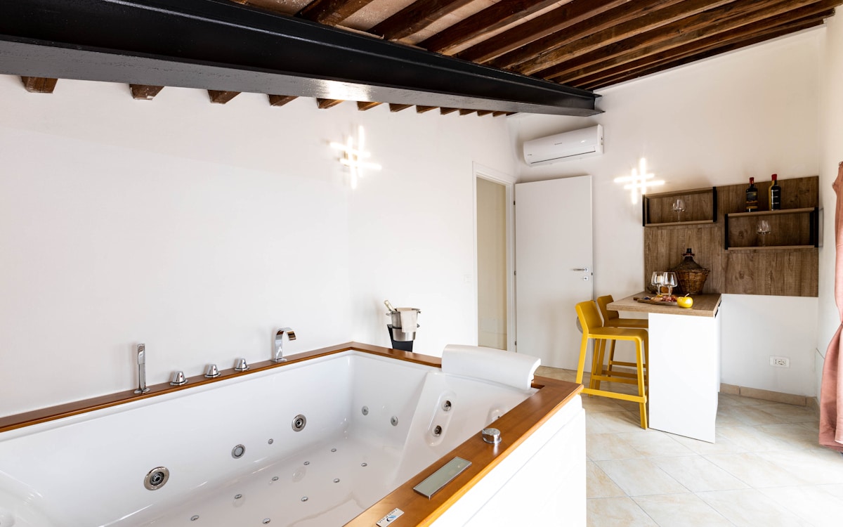 Genießen Sie darüber hinaus den Außenbereich mit zwei bequemen Liegen und einem schattenspendenden Sonnenschirm am privaten Pool, sowie die Möglichkeit, ein köstliches Frühstück direkt im Zimmer zu bestellen. Zudem steht Ihnen ein Grill zur Verfügung, und auf Wunsch kann ein Babybett bereitgestellt werden.